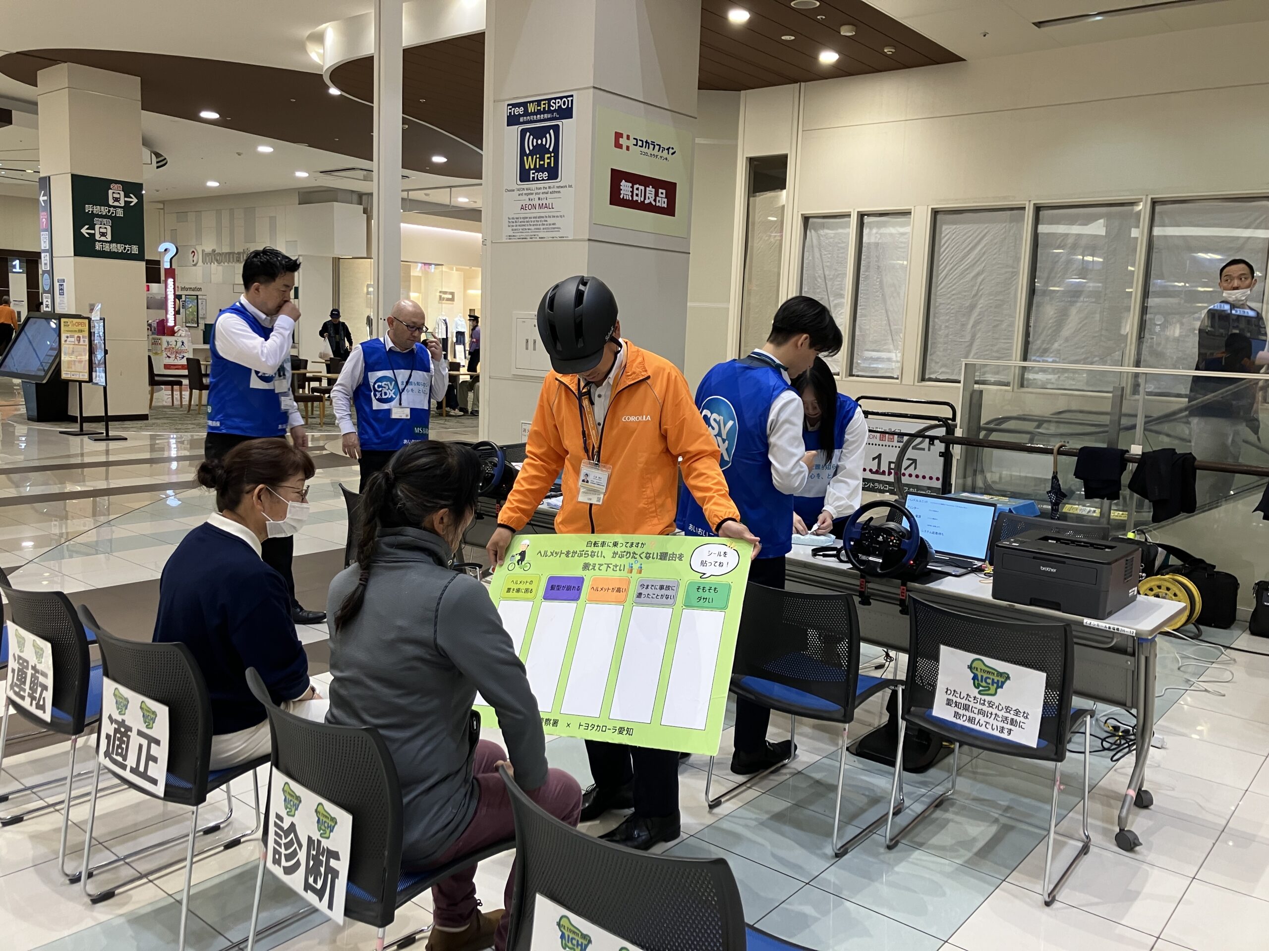 この4月より道路改正法により青切符制度が導入され、ヘルメット着用アンケートとドライビングシュミレーターで